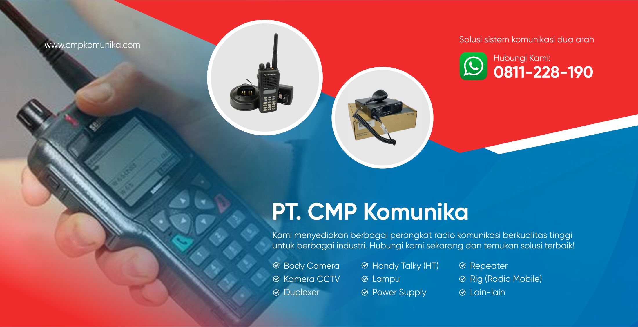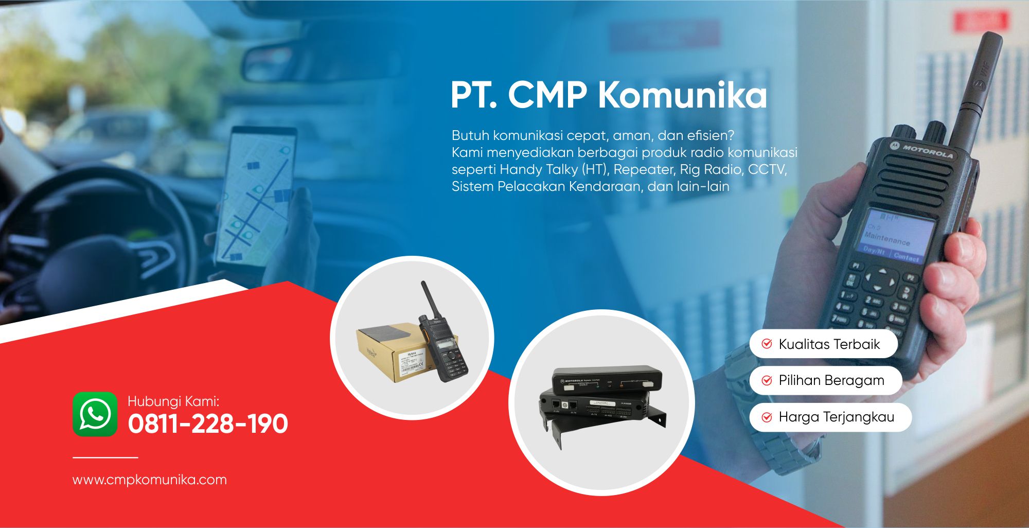 PT. CMP Komunika adalah perusahaan yang bergerak di bidang penyediaan solusi komunikasi profesional, khususnya dalam perangkat radio komunikasi. Kami menawarkan berbagai produk berkualitas seperti handy talky (HT), repeater, rig, POC, CCTV, dan aksesoris pendukung lainnya yang digunakan di berbagai sektor, termasuk industri, keamanan, transportasi, dan pemerintahan. Dengan pengalaman bertahun-tahun, kami berkomitmen untuk menyediakan produk dengan teknologi terbaik, layanan pelanggan yang responsif, serta dukungan teknis yang handal untuk memastikan komunikasi yang lancar dan efisien bagi para pelanggan kami.
